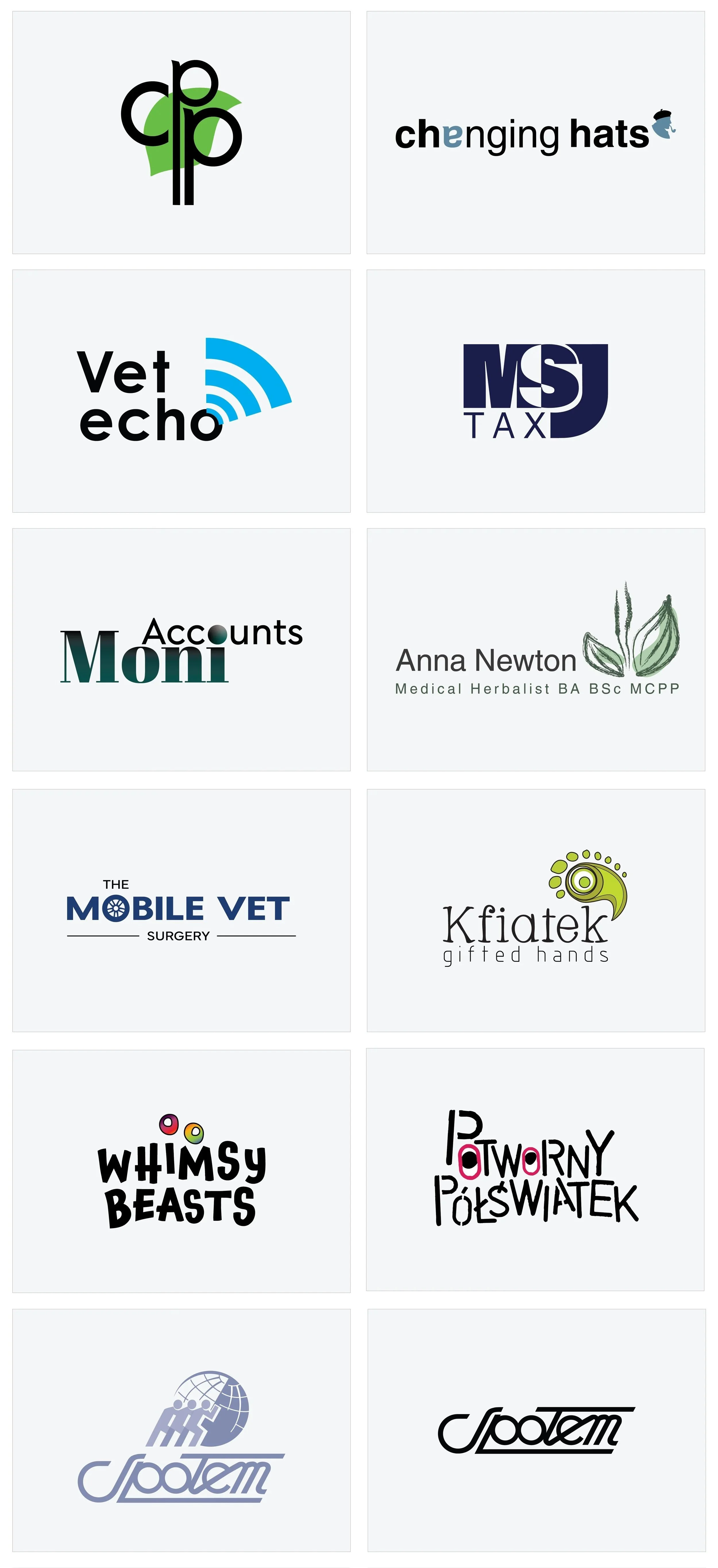 A selection of logo designs created for various clients and brand concepts, showcasing a range of styles, industries, and typographic approaches.